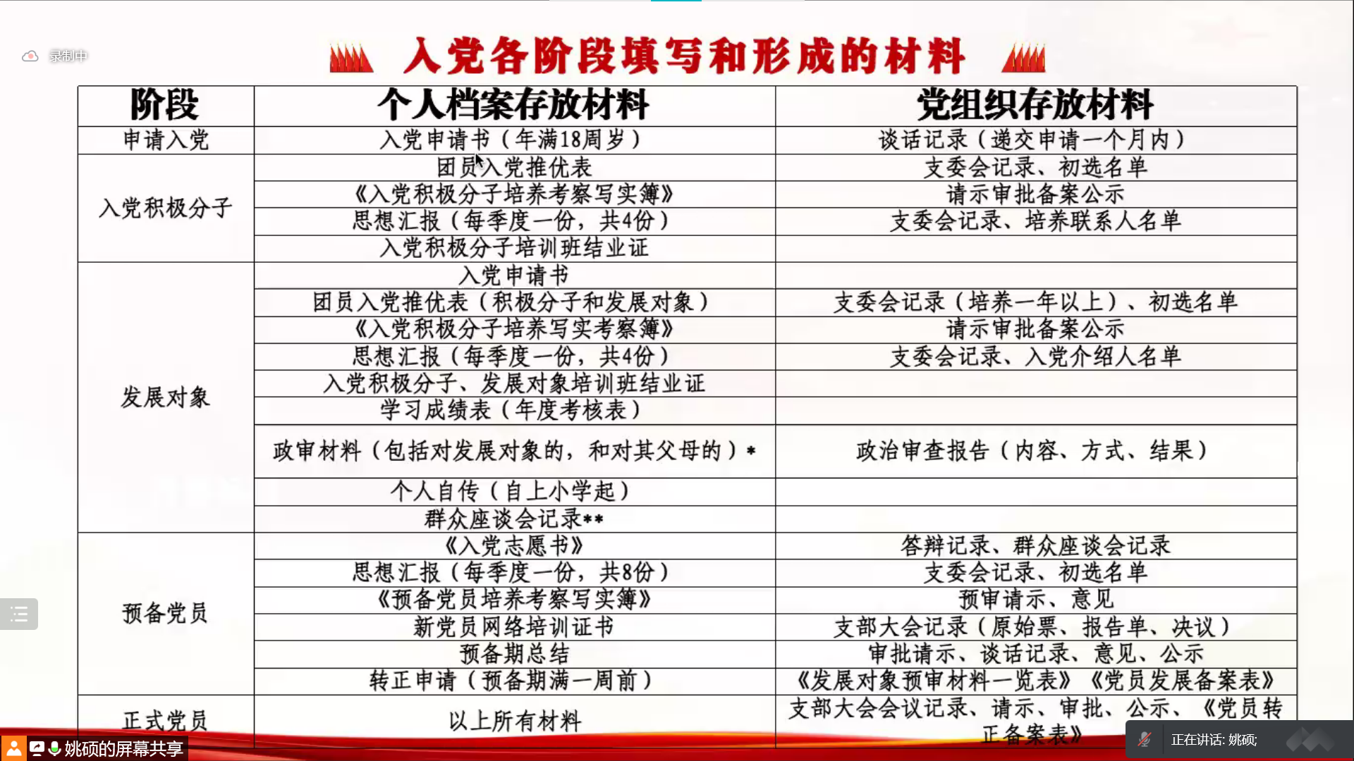 姚硕向同学们介绍了党员发展工作流程及注意事项,她希望各学生党支部委员严格执行党员发展工作流程,注意材料填写细节,并强调入党积极分子、发展对象要端正态度,认真学习,严格遵守党员发展流程。