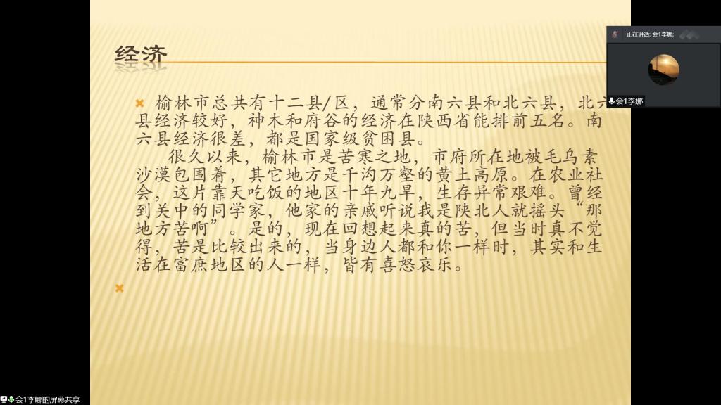 此外,来自榆林的同志分享了家乡发展现状与自我学习心得。李娜和杜瑜两位党员通过视频的方式介绍了榆林市近几年的发展,她们从榆林的经济发展、荒漠治理、交通变化、教育水平等方面介绍了在党的领导下,发生了翻天覆地的变化。