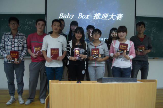 团委学生会社团部举办了Baby Box 杯推理大赛。推理大赛决赛于5月7日晚在文科楼132隆重举行,学生会主席团成员陈安琪等作为评委参加了此次活动。 经过初赛、复赛的选拔,共有十个小组脱颖而出,登上今晚决赛舞台。本次比赛共有三个环节,第一环节是卡片数字游戏,即根据PPT展示的三十张图片猜出对应的数字。第二个环节就是大家熟悉的“你划我猜”。此环节为抢答部分,比赛进行的异常激烈,整个赛程高潮不断,掌声此起彼伏。最终,非凡异族与阿兹卡班两队晋级到决赛最后一个环节——谁是凶手。在观看悬疑视频后,两队辩手正式开始答辩,迅速将会场温度点燃。双方你来我往,言辞犀利,就“到底谁的是凶手”这个主题展开激烈辩论。在这个过程中,双方选手的口才和应变能力展现的淋漓尽致,同时也将决赛又一次推向高潮。最后,阿兹卡班队在经过激烈的竞争后成功夺冠。