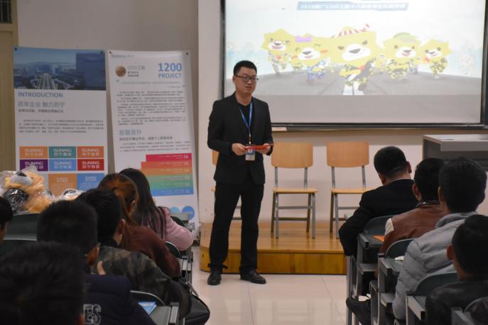 本次宣讲会由苏宁云商宁夏地区总经理赵培亮担任主讲人。在简短的互动竞猜以及公司视频简介之后,他首先就苏宁发展历程进行介绍,随后,赵培亮介绍了苏宁的六大集团当下的的运营状况、未来的发展目标以及1200工程招聘人才的职业发展。随后利用视频的方式,向大家展示了苏宁云商的各类部门及相关职位,到场和视频里的1200工程往期代表讲述了对在苏宁工作和1200工程的看法和感受。最后,到场的苏宁人与现场同学进行互动,为同学们关于未来的职业规划等问题答疑解惑。
