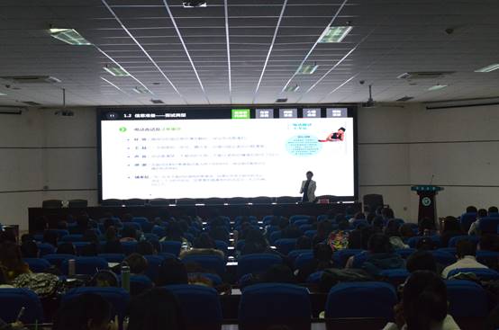 作为职业规划的主讲人,潘瑞老师首先将毕业生面试前的准备具体分为信息资料准备、仪表准备、问题准备、心理准备、模拟准备五个部分。随后,就信息资料准备进行了详细的讲解,借助视频资料使毕业生更好的了解面试中遇到的各种问题。接着,潘瑞对其他准备进行了具体的介绍,会场的同学们十分投入,认真标记重点。最后,潘瑞希望同学们结合老师所讲内容做好自身职业生涯规划,同学们纷纷表示受益匪浅。