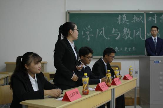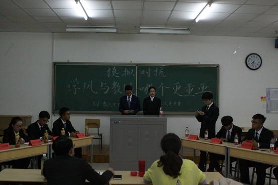 本次模拟辩论赛分为五项环节。首先由正方一辩论述正方观点,他认为学风比教风更重要,并从三个方面对自己的观点进行了阐述,论证有条有理,论点强劲有力,而反方一辩也不甘示弱,也从三个方面提出了相反的观点,认为教风比学风更重要,陈词尽显锋锐。其次进行一对一公辩,由双方二三辩提出对方见解的不足,并解释己方观点,每人有半分钟的论述时间。随着比赛的进行,空气中的“火药味”越来越重,比赛也到了关键性时期——自由辩论环节,辩手们不愧为多场比赛中脱颖而出的佼佼者,相互的反驳令观众啧啧称叹,大家的掌声更是连绵不断。高潮过后,由双方一辩进行立论总结,指出对方在辩论中的不足论点与论据,并论述己方的论点。到了比赛的最后阶段,双方四辩用高度概括性的总结陈词为本场比赛画上了圆满的句号。最后由评委老师对参赛选手进行评价,指出了两方的不足与优点,并希望参赛选手在正式辩论赛上能够沉着应对,让自己的论据清晰确凿有条不紊,争取得到一个好名次,为经管学院赢得荣誉。