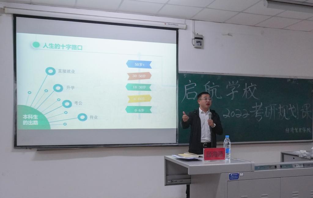 于9月16日19:00-22:00在文荟楼130室举办针对2022年考研的规划讲座,邀请了北京启航学校顾海源作为宣讲嘉宾,2018级、2019级有考研意愿的本科生参加了本次讲座。