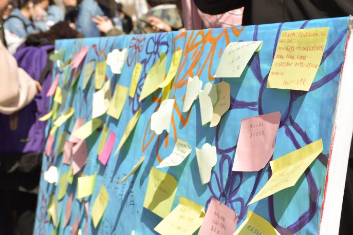 活动期间,同学们争先在展板上写下平日想说却说不出的话,或是对暗自倾慕之人,或是对自己最亲近敬爱的人,可以看到的是,每个人放下笔后脸上都满是欣喜。在写下心里话之后,同学们纷纷去签到参与抽奖活动,这让大家充分体会到了活动的趣味性。活动最后在欢快的氛围中结束。