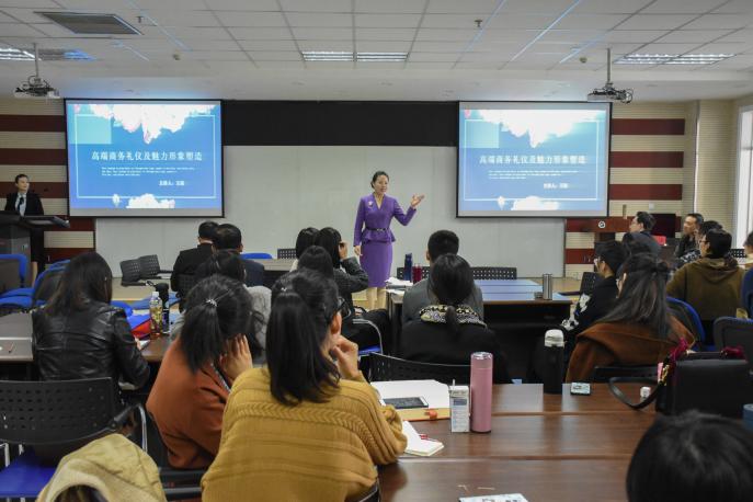 MBA学员们济济一堂。由环球礼仪商学院的高级礼仪培训师王婧老师主讲的《商务礼仪及魅力形象塑造》培训会准时开讲。