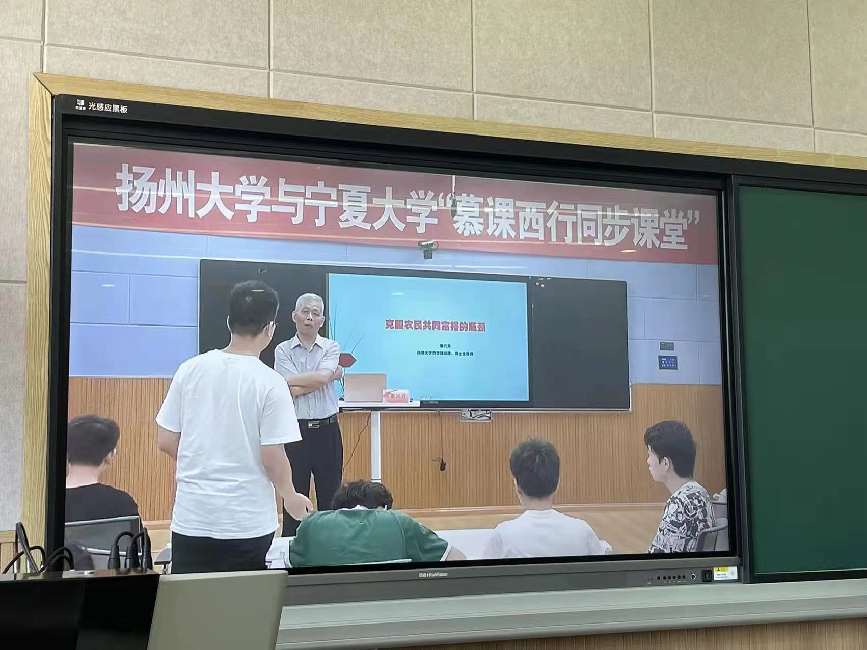 6月16日上午,污污漫画 与扬州大学慕课西行—同步课堂启动仪式与同步课堂教学活动在污污漫画 贺兰山校区兰山一教C-202教室顺利开展。一块屏幕连通东西,两校学生共同展望,本次课堂借助智慧树在线平台及硬件设备,实现两校师生隔空互动、两校课堂同步进行。