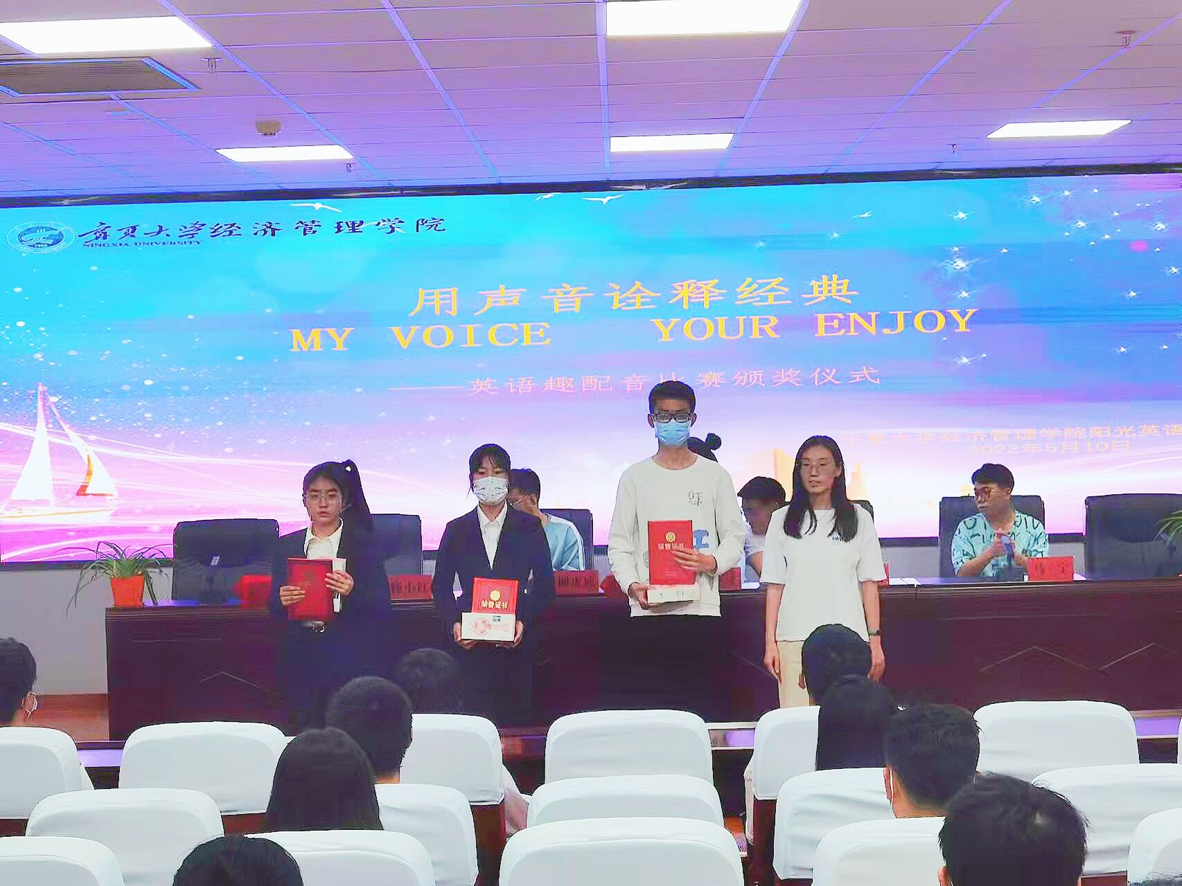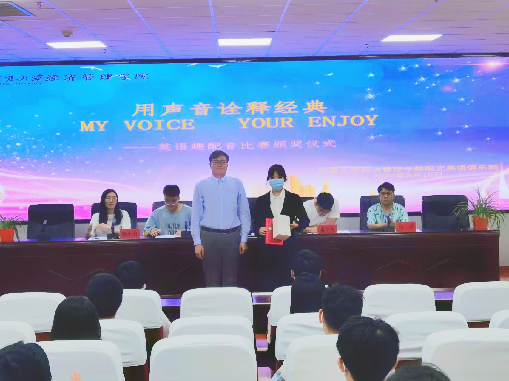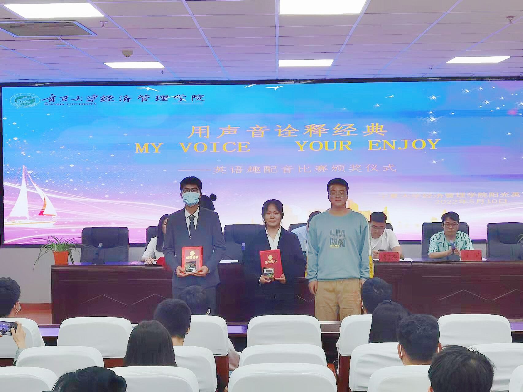 英语趣味配音比赛中,阿克丽娅·居马汗获得一等奖,赵泳杰、杨蓉蓉获得二等奖,马荣、陈海者、袁诠获得三等奖,陈欣媛、李璇瑛、张倩及法学院马彩云获得优秀奖。