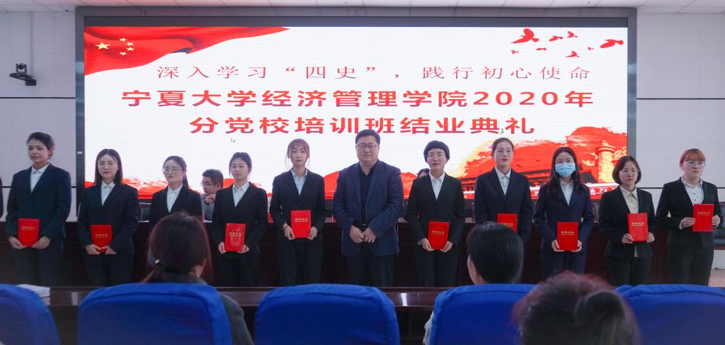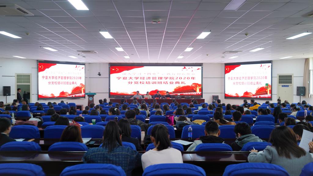 于贺兰山校区文荟楼东报告厅举行了分党校2020年秋季班党课结业典礼。学院党委副书记程胜利、经济学本科生党支部书记何韶华、工商管理本科生党支部书记姚硕、会计学本科生党支部书记孙文元以及十一期、第十二期发展对象和第三十五期、三十六期入党积极分子到场参加。