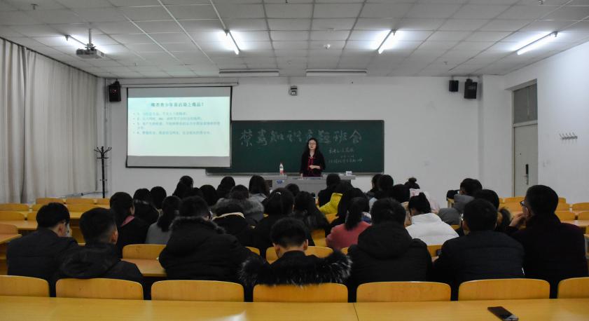 18级金融班在贺兰山校区文荟楼124室举行了禁毒知识主题班会。本次班会由18级辅导员王嘉豫主持。