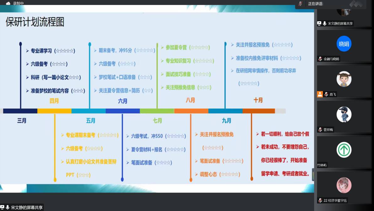 崔琳琳结合个人情况详细介绍了保研的前期准备,并就面试应答、投递院校给出相关策略,帮助同学解答如何回答面试问题等相关问题。她希望同学们对自己未来提前做好规划并尽快行动。孔令怡详细介绍了大一到大三保研的学习生活:大一应提前做规划并尽快熟悉环境,培养自己独立思考意识,享受丰富的大学生活;大二在掌握学习成绩的基础上多参与含金量高的竞赛并尝试撰写论文;大三稳住专业排名、坚持学习英语并开始准备保研相关事宜。马和霞分享了个人支教经历和大学生活,并结合自身获奖、入党经历鼓励同学们有选择地参与兴趣活动来锻炼、提升自己。