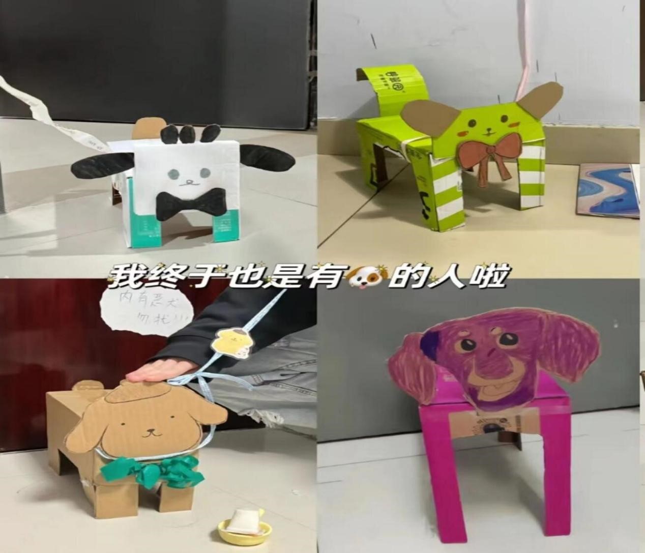 随处可见的纸箱经过创意改造,变成了精致可爱的纸箱宠物,不仅给同学们的生活增添了乐趣,而且展现了同学们的想象力和创造力。