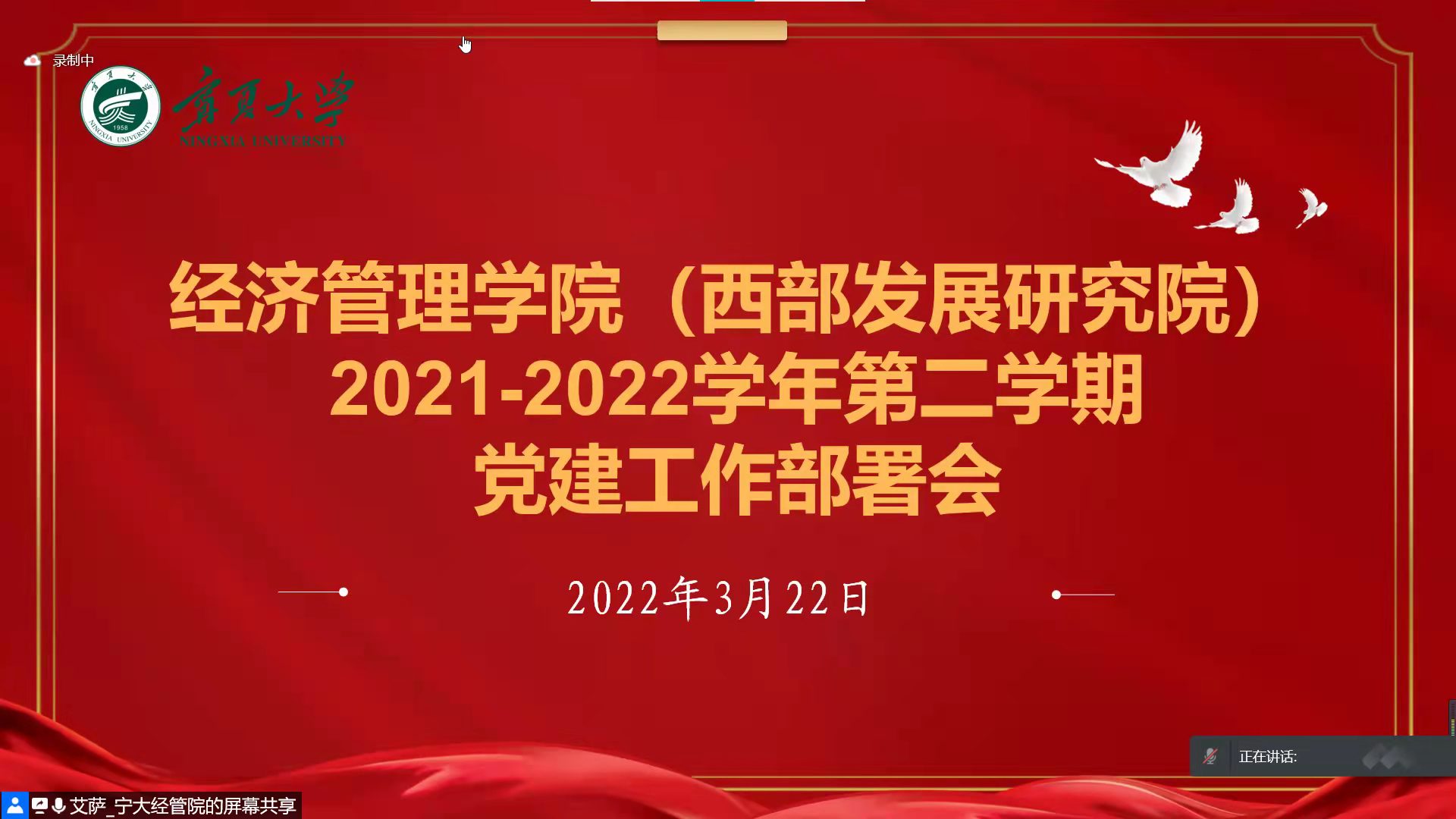 3月23日下午,污污漫画 (西部发展研究院)2021-2022学年第二学期党建工作部署会在线上举行。院党委书记李胜刚、西部发展研究院副院长马军、院党委副书记马建宏、院党委委员仇娟东、学生工作办公室艾萨·阿尤普、姚硕、各党支部书记、全体教职工党员、学生党员参加本次会议。本次会议由艾萨·阿尤普主持。