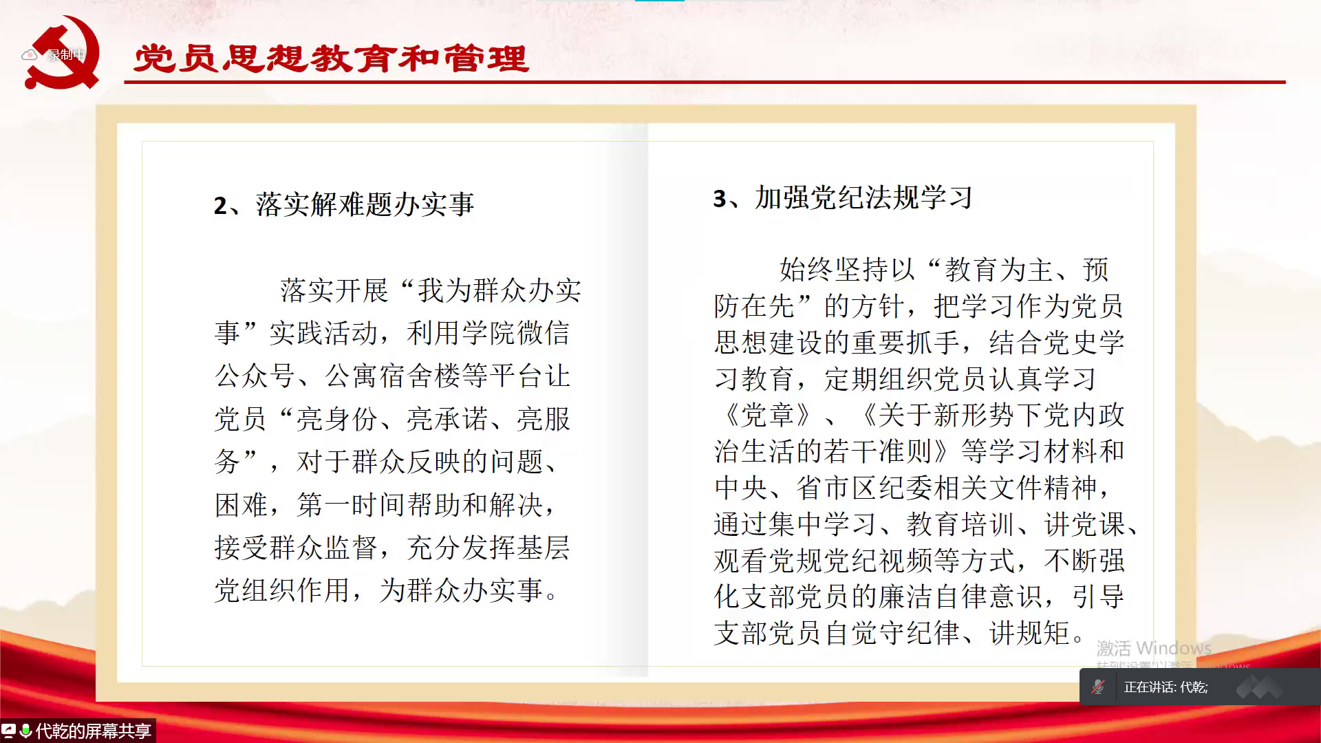 凡事预则立,不预则废。马建宏对本学期党建工作进行部署。马建宏表示今年党建工作要以强化、传承党史学习教育已取得成果为主要思路,以健全各项制度、突出党员作用、党支部建设标准化为目标,以强化组织建设、培育党员、组织特色活动为任务。马建宏希望各党支部在工作中主动思考、自主创新,提高群体效能。