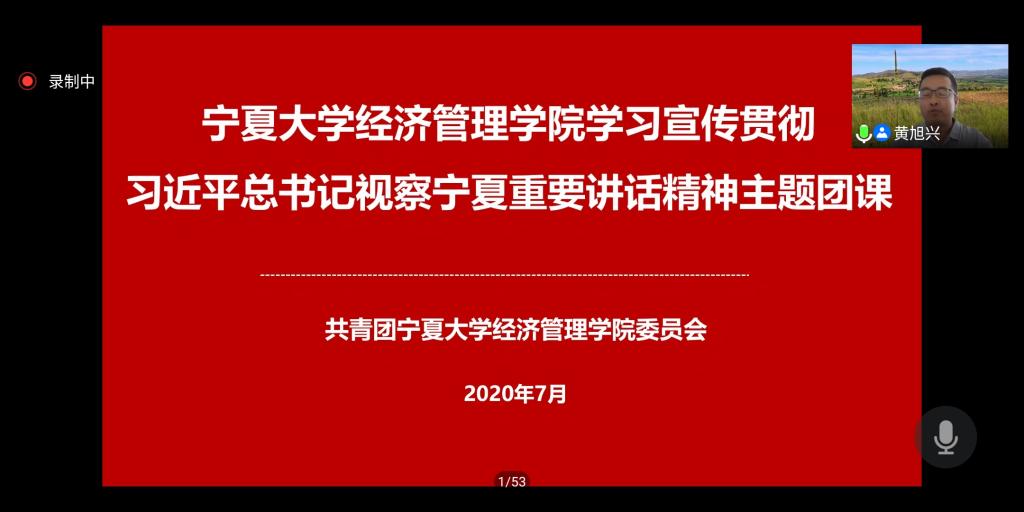 开展学习贯彻习近平总书记视察宁夏重要讲话精神主题团课,学院团委书记兼学生办公室主任黄旭兴、院团委组织部负责人籍楚妮及2019级全体学生参与,本次团课由籍楚妮主持。