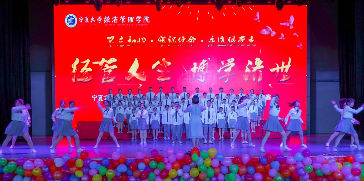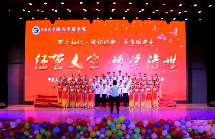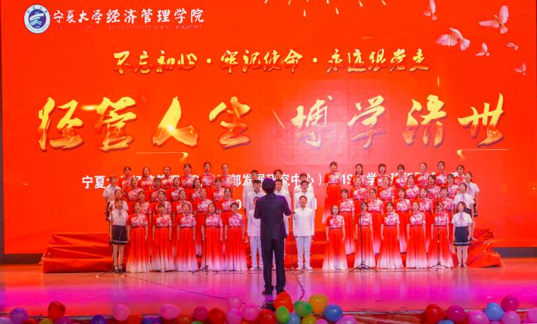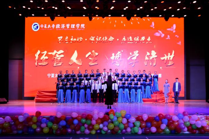 《没有共产党就没有新中国》,中国共产党一经成立,就义无反顾肩负起实现中华民族伟大复兴的历史使命。在数年的时局动荡下,《中国军魂》谱写了一曲曲中华赞歌。1949年10月1日,《当那一天来临》,中国人民真正地《站起来》了,从此中华民族踏上了繁荣富强的《征程》。一颗中国心,一生中华情。“《我和我的祖国》,一刻也不能分割”“家是最小国,国是千万家,我爱我的国,我爱我的家”,唱至副歌部分时,同学们高亢的歌声点燃了台下的观众,全场大合唱让人心潮澎湃。《我们都是追梦人》,《奔跑》在《阳光路上》,深情唱响《我爱你,中国》。每首歌的背后都是共产党人的心血,每一声旋律都声动梁尘,震撼着每一位听众的心。演毕,全场掌声雷动,喝彩声不绝于耳。最后,由学院教师代表付森、刘涛、虎兴武、程胜利和经管辩论队带来的《为你读诗—中国礼赞》再次掀起了全场高潮,他们铿锵有力的朗读声久久回荡在会场上空。