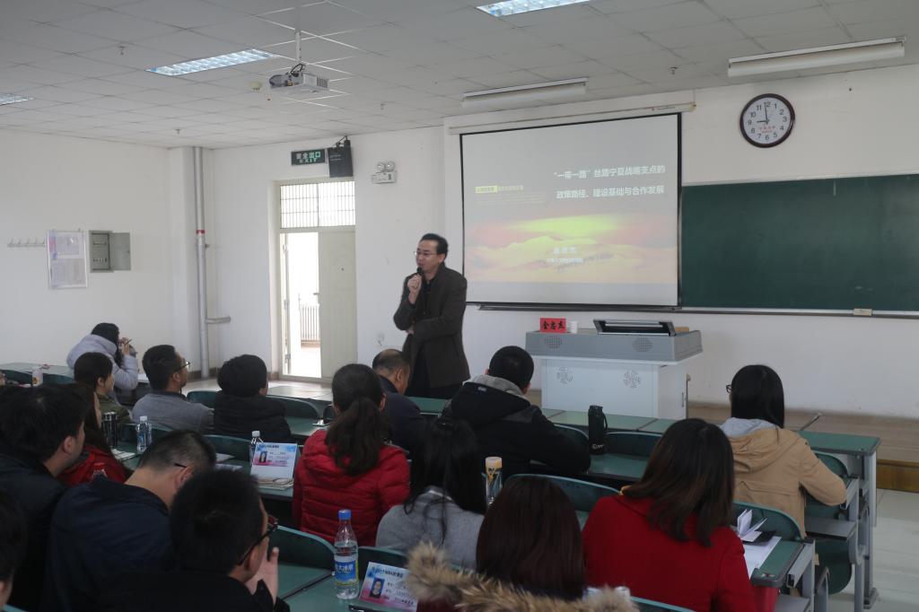 金教授由“从西域蛮荒到东方丝绸之路”讲起,将丝绸之路的古代起源与必经之路和现代丝绸之路联系在一起,讲解了通过西部大开发战略和中阿合作出现的合作共赢的效应。其次,他从宁夏战略支点实行通道经济的主要意义、西部区域实行通道经济的可行性以及必然性三个方面阐释了丝路宁夏战略支点的合作发展问题。对五通合作、43885建设和阿拉伯国家经济体系构建以及试验区规划做了详细介绍。最后,金教授对丝路宁夏战略支点对阿经贸合作中应注意的关键点提出了自己的见解。他指出,社会不会因个人的停止而停止,一个国家只有不断创新与发展,才能强盛不衰。金教授对“一带一路”与中阿合作问题有着深入的研究,通过他的讲解,大家对政策意义有了更新更深的认识与理解。