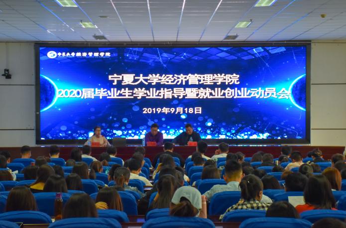 在贺兰山校区文荟楼东报告厅举行2020届毕业生学业指导暨就业创业动员会。与会领导包括院党委副书记程胜利、新疆特派教师巴塔、16级辅导员何韶华。2016级全体学生到场参加。