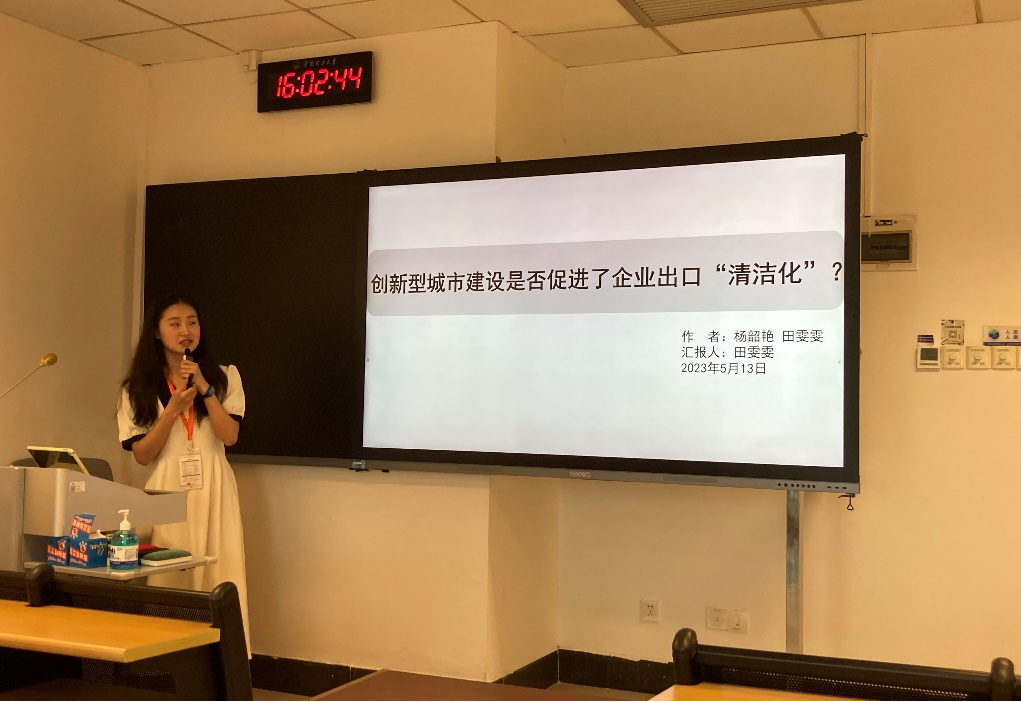 本科生田雯雯汇报了论文《创新型城市建设是否促进了企业出口“清洁化”?》。论文立于创新型城市试点政策是否提高了企业出口“清洁化”的视角,利用2006-2014年中国工业企业数据库、海关数据库与工企污染数据库等的数据匹配结果,运用基于倾向得分匹配的渐进双重差分法检验了创新型城市试点政策对出口企业SO2排放的影响。研究发现,试点政策有利于促进企业出口“清洁化”,且对于西部地区、非省会城市、非国有企业、外资企业和加工贸易企业的出口具有更强的“清洁化”作用。本研究为我国绿色贸易发展提供了微观经验证据,对创新驱动经济高质量发展具有重要意义。