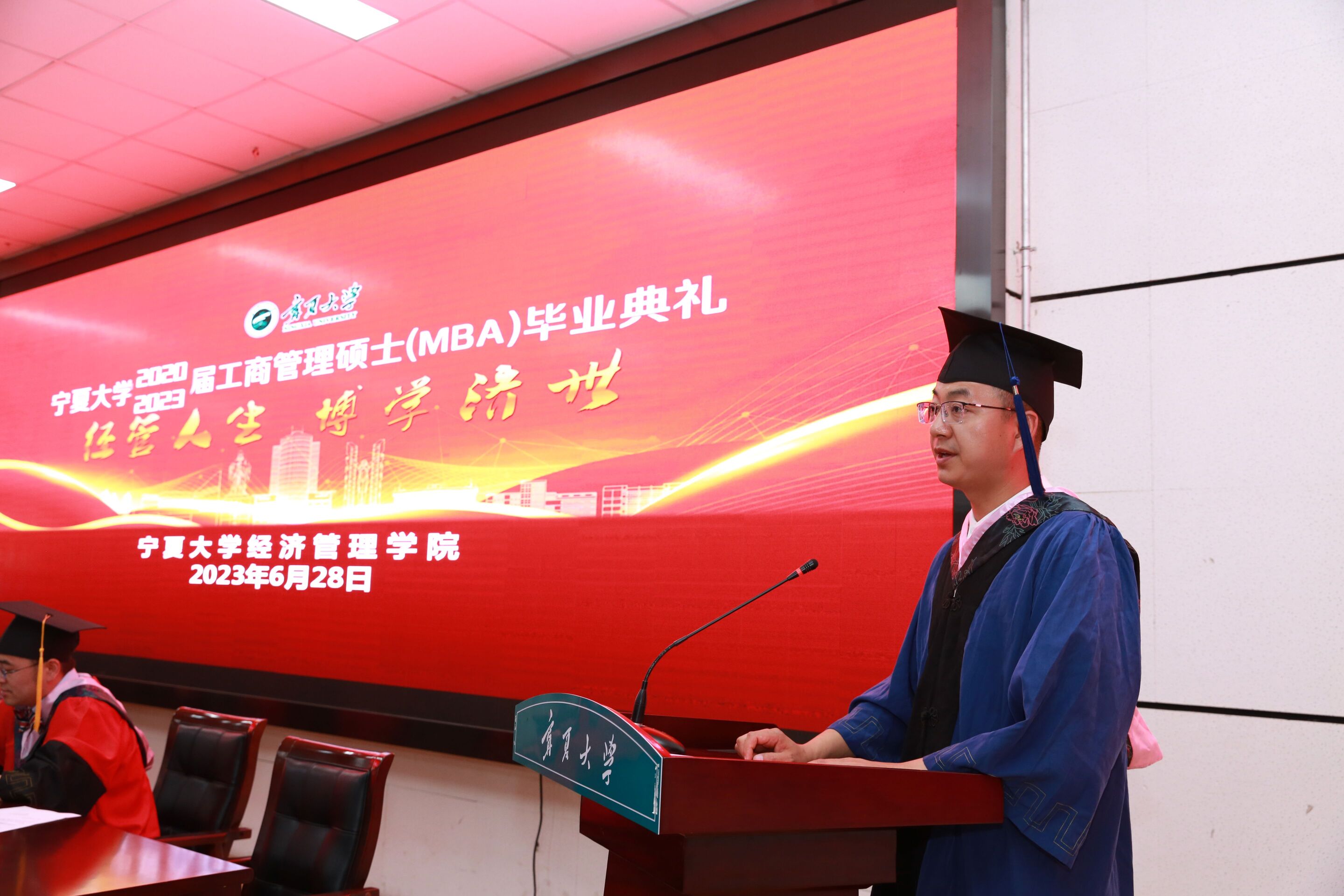 2023届毕业生代表施树金同学发言学回顾了三年学习经历期间,学院统筹防控与教学,师生同心共克时艰的经历,代表2023届MBA毕业生向学院和老师们致以了无限感激和崇高敬意,表达了对母校深深的眷恋与不舍,也表达了毕业后继续拼搏努力,以优秀表现回报母校培养的决心。
