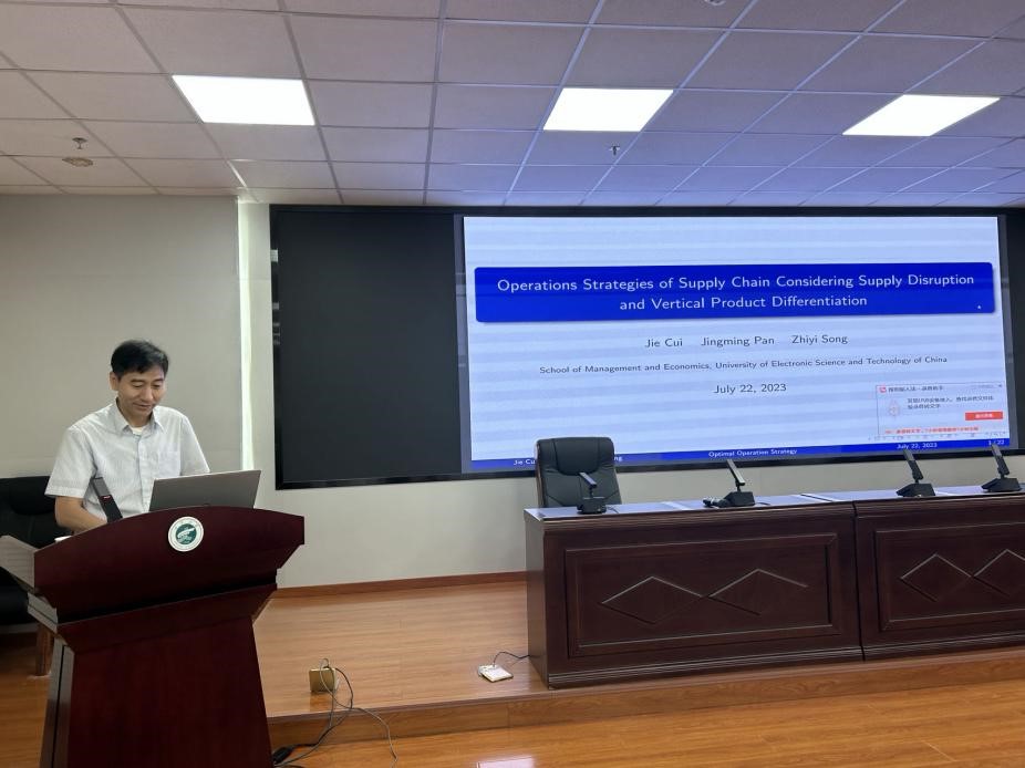 电子科技大学经济与管理学院潘景铭教授汇报题目为《Operations Strategies of Supply Chain Considering Supply Disruption and Vertical Product Differentiation》。汇报从Introduction、Research Questions、Model and Equilibrium、Comparison of Sourcing Strategies、Conclusions五部分展开,针对去全球化背景下供应链的稳定性以及断供风险下企业如何构建供应链进行分析。