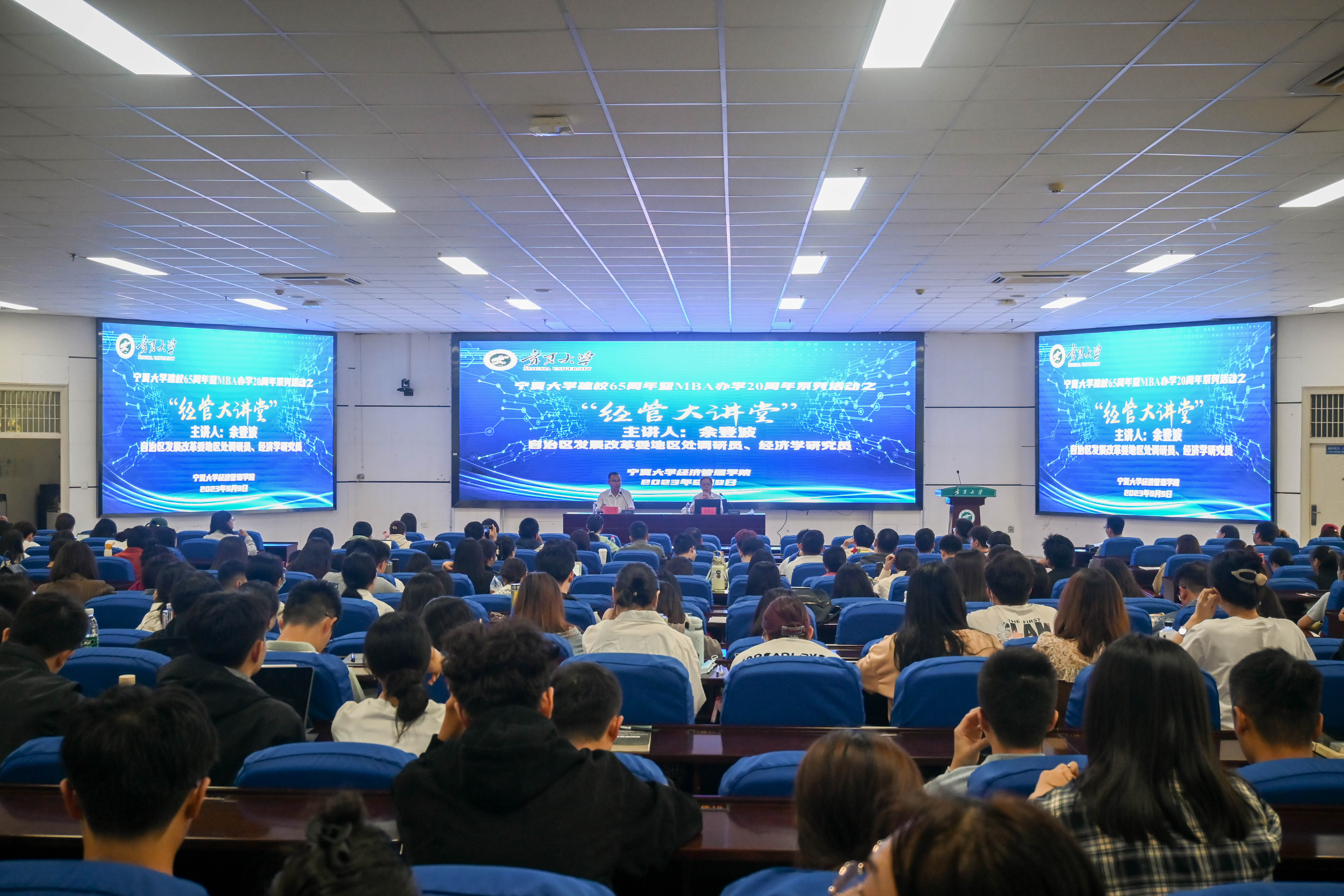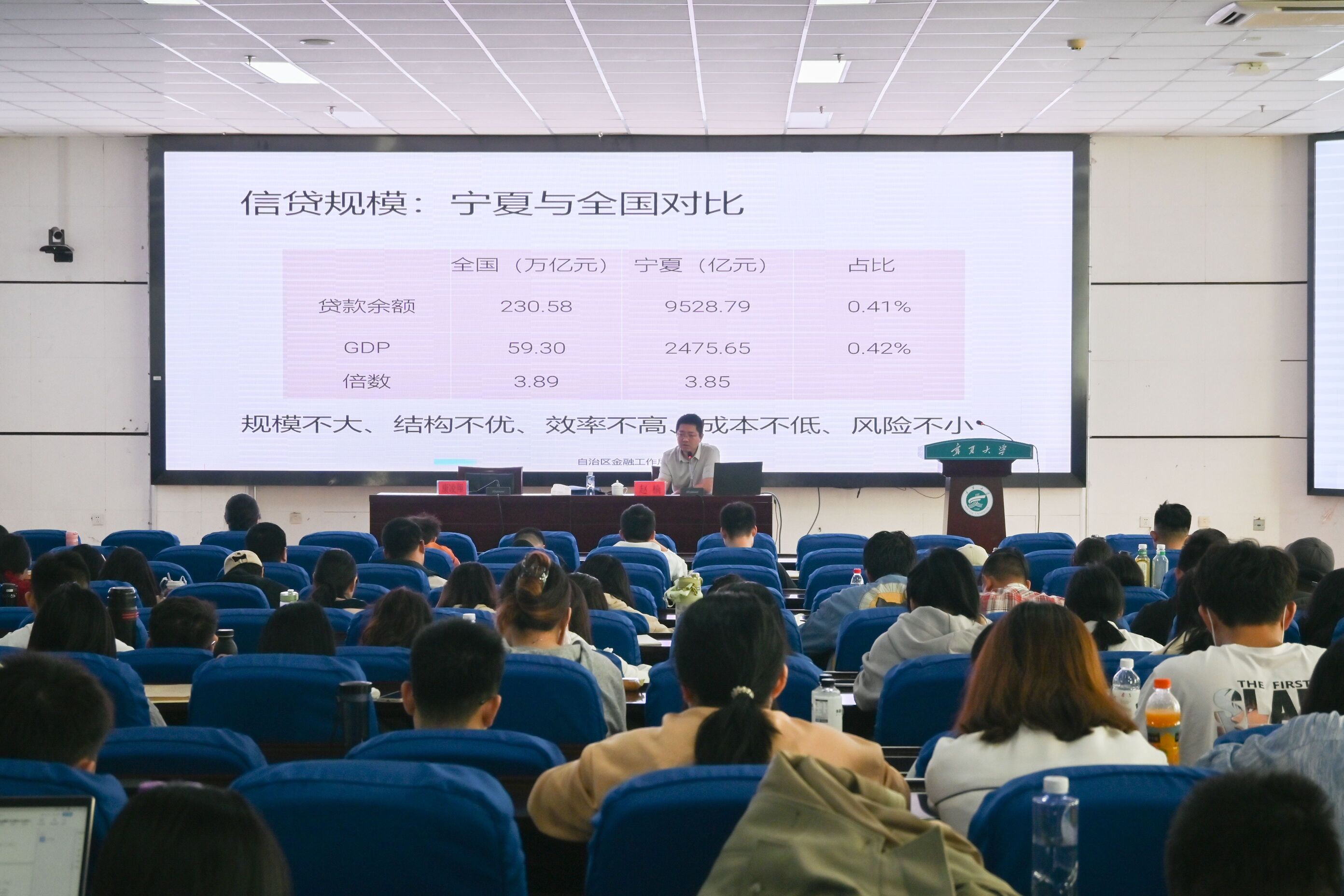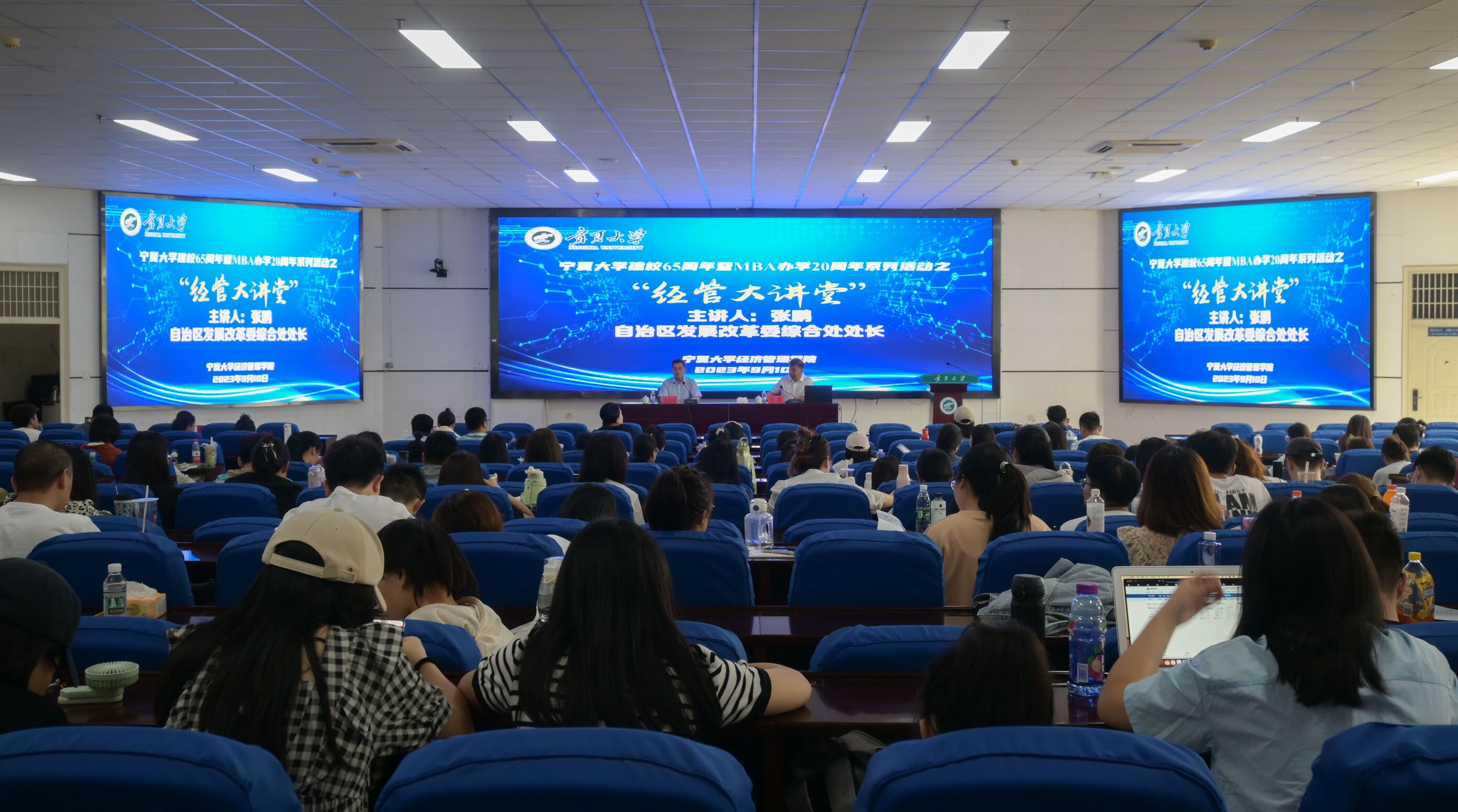 建校65周年暨MBA办学20周年系列活动在贺兰山校区文荟楼东报告厅举行。自治区发展改革委地区处调研员、经济学研究员余登波,宁夏银行党委书记、董事长沙建平,百瑞源枸杞股份有限公司董事长郝向峰,自治区地方金融监管局办公室主任赵楠,自治区发展改革委综合处处长张鹏等,作系列报告。学院部分教师、2023级研究生、部分本科生共300余人参加会议。
