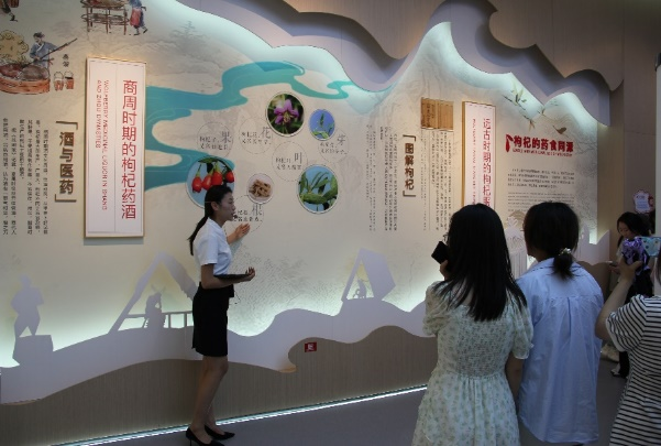 最后,我们来到了以养生文化为主题的宁夏百瑞源枸杞博物馆。馆内分为杞福馆、文化馆、养生馆和尚善茶馆四部分,通过对博物馆的实地参观和工作人员对百瑞源发展历史的讲解,我们对百瑞源产品的研发、生产流程、质量控制、营销策略等方面有了更直观的认识。公司负责人还为我们准备了枸杞芽茶,通过与企业董事长和管理人员进行了座谈,大家就行业发展趋势、人才需求等问题进行了深入探讨。本次走进百瑞源的品牌文化馆,亲眼感受和捕捉宁夏枸杞产业龙头企业的经营理念、污污漫画、生产现场及蕴含其中的百瑞源人追求卓越勇立潮头的奋斗精神,为学生搭建了良好的平台,促进了产学研的深度融合。