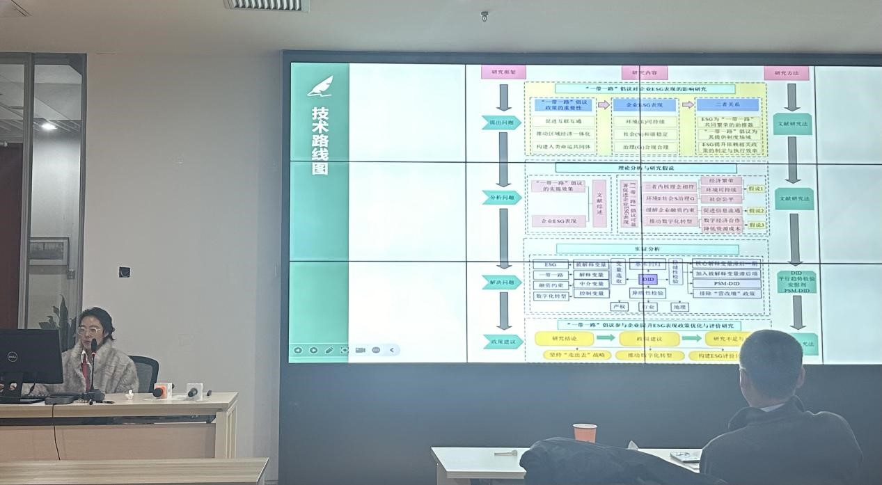 研究生杨萍报告论文题为《“一带一路”倡议与企业 ESG 表现》。论文将“一带一路”倡议作视为准自然实验,选取2010-2022年间中国沪深股市的上市公司作为分析样本,运用双重差分(DID)模型来评估该框架对企业ESG绩效的影响。分析结果显示,“一带一路”显著增强了企业的ESG绩效;进一步的机制分析发现,“一带一路”倡议能够通过减轻企业的融资压力和推动企业进行数字化升级两种途径来提高其ESG绩效;异质性分析揭示了“一带一路”倡议对ESG绩效提升效果在国有企业、非重污染企业和东部地区企业中更为显著,并排除了“营改增”政策的干扰。