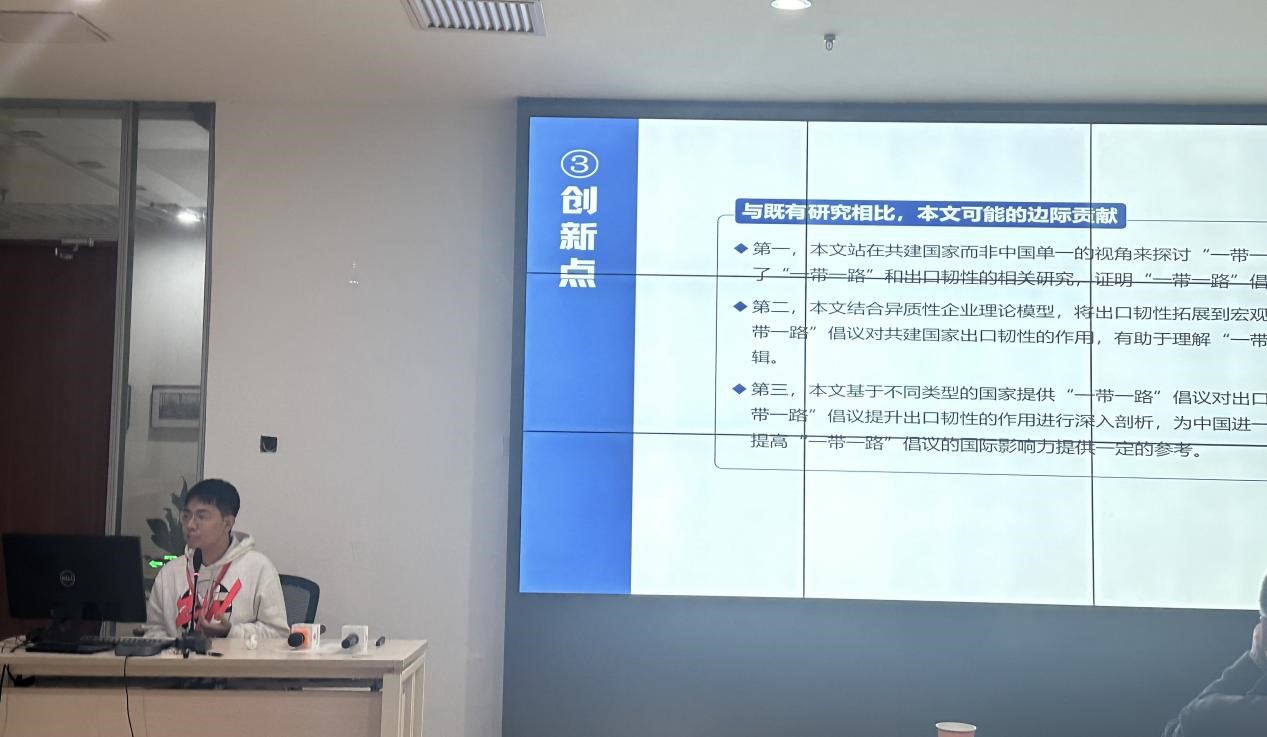 研究生高睿报告论文题为《轻关易道:“一带一路”倡议与共建国家出口韧性提升》。论文基于2009—2022年各国出口相关数据,构建多期双重差分模型,考察“一带一路”倡议对共建国家出口韧性的影响。研究发现:“一带一路”倡议显著提升了共建国家的出口韧性,主要通过在需求端拓宽出口集约边际和广延边际,在供给端降低出口成本三种渠道,特别是对于高收入国家、开放水平高的国家和治理能力强的国家有更强的提升作用。