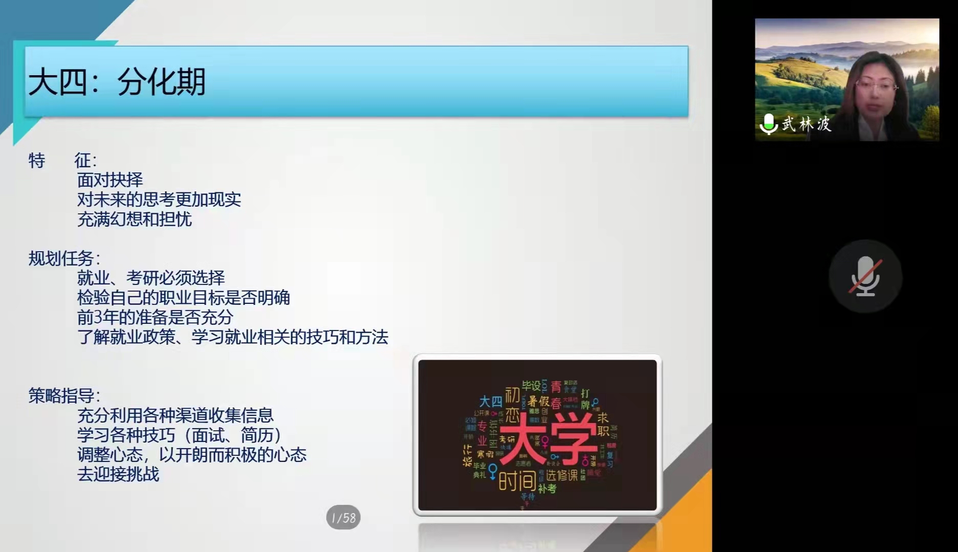 武林波表示,同学们应该明确职业生涯规划的重要性,提前确立目标,尽早进行自我探索,优先了解自己的优劣势,并以此为基础学习专业知识,为今后的职业生涯做好充分的准备。武林波谈到,面对现状,大学生不应该只为考研做准备,更要提前做好面对工作的准备。她希望同学们调整心态,意识到非理想就业的可能性,多一些实践探索,并积累更多工作经验的机会。