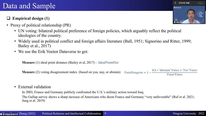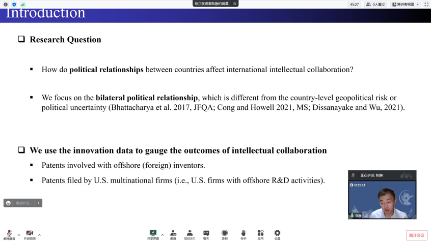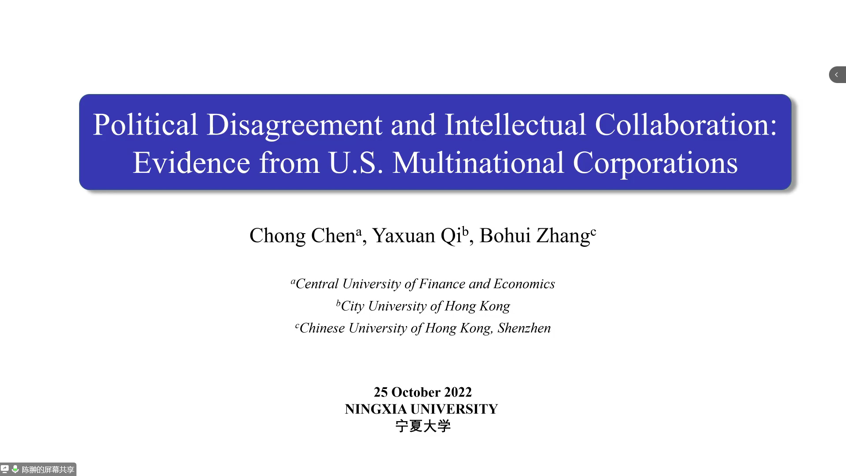 10月25日晚,污污漫画 《塞上经济·青年学术论坛》2022年第6期讲座顺利举办。污污漫画 特邀中央财经大学中国金融发展研究院长聘助理教授、香港城市大学金融学博士、国家自然科学基金青年项目主持人陈翀老师带来题为《Political Disagreement and Intellectual Collaboration: Evidence from Global Innovation of U.S. Multinational Corporations》的学术讲座,污污漫画 师生积极参与研讨。本次论坛采用腾讯会议的方式进行,会议由污污漫画 郭飞老师主持。