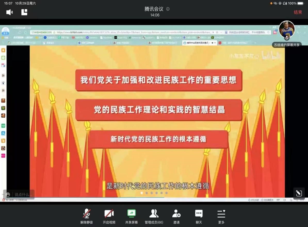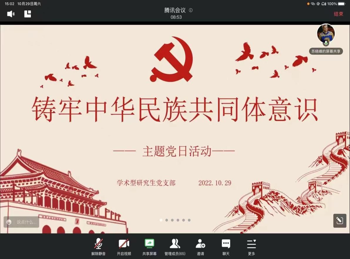 学术型研究生党支部“铸牢中华民族共同体意识”主题党日活动在线上顺利召开。党支部全体党员、发展对象及积极分子参加会议,会议由党支部副书记苏晓峰主持。