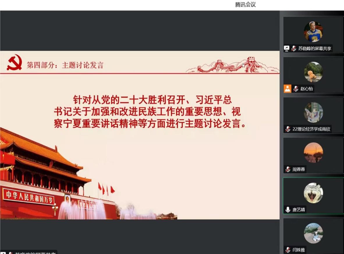 在讨论分享环节,党员代表刘仁杰表示作为新时代的大学生,我们要从认知、情感、行为三个层面,自觉铸牢中华民族共同体意识,坚持中华民族利益高于一切;唐艺婧从了解红色政权如何在宁夏扎根,宁夏人民如何支援抗战是一段可歌可泣的故事中认识到民族团结是我国各族人民的生命线,中华民族共同体意识是民族团结之本;范璐杰指出要扎扎实实铸牢中华民族共同体意识,56个民族始终心往一处想、劲往一处使、拧成一股绳,一定可以让让民族团结进步之花长盛不衰,共创中华民族大家庭的美好未来。