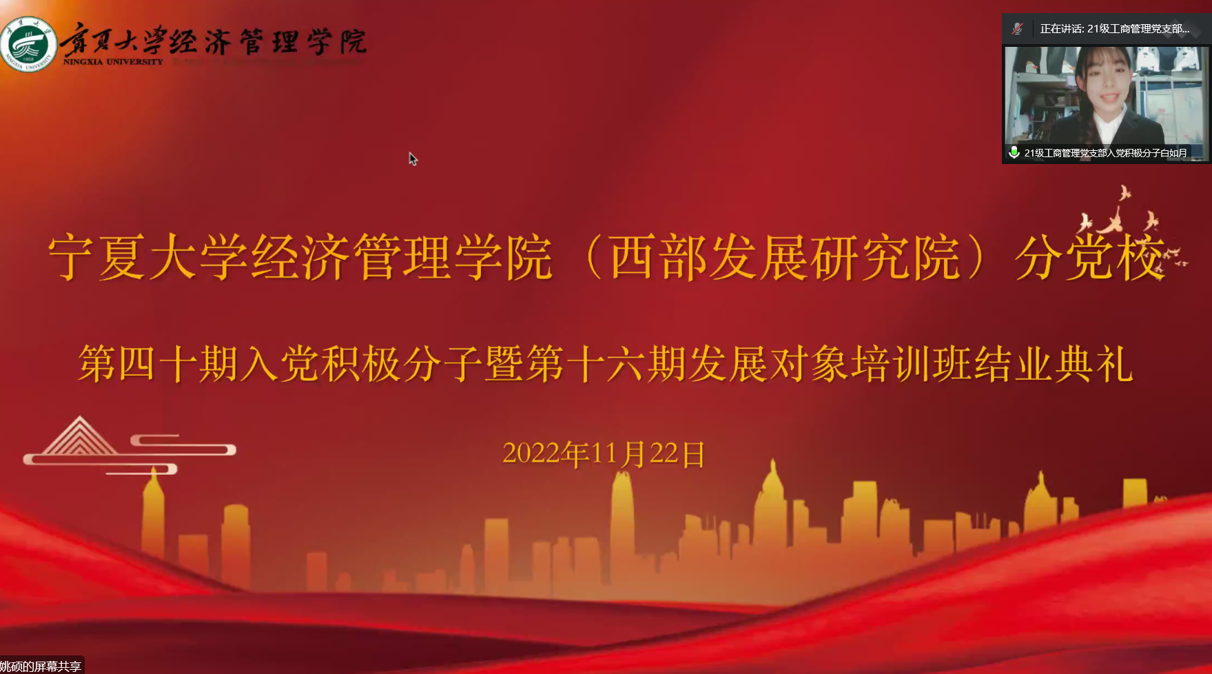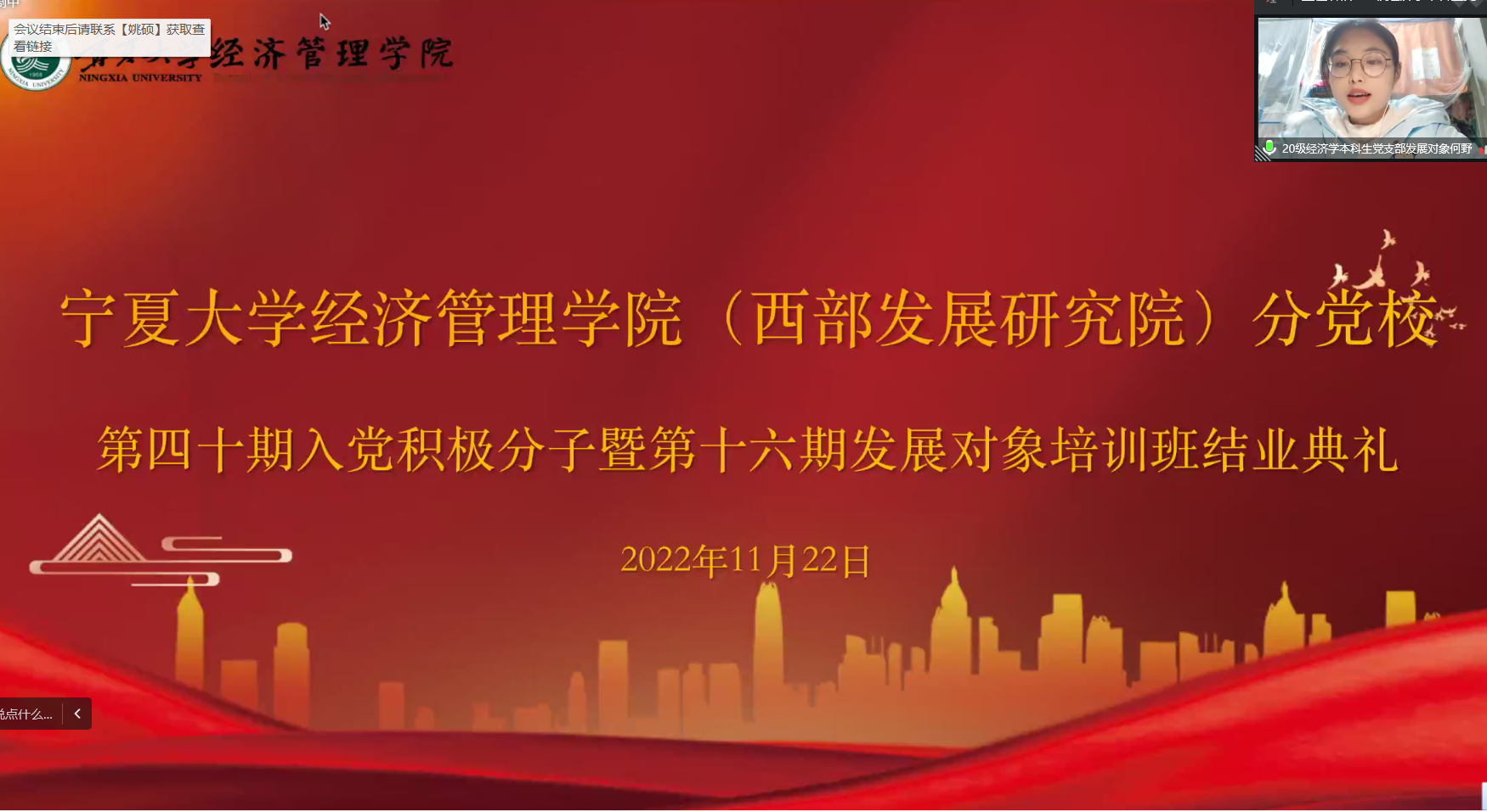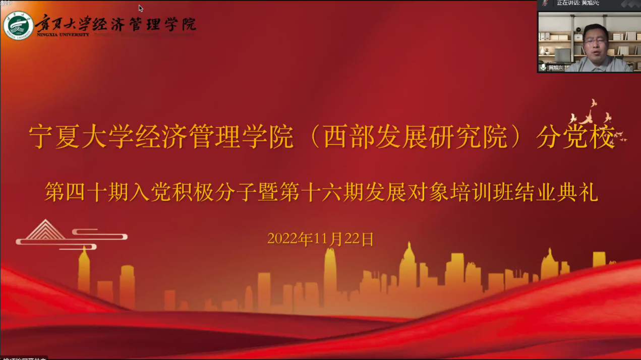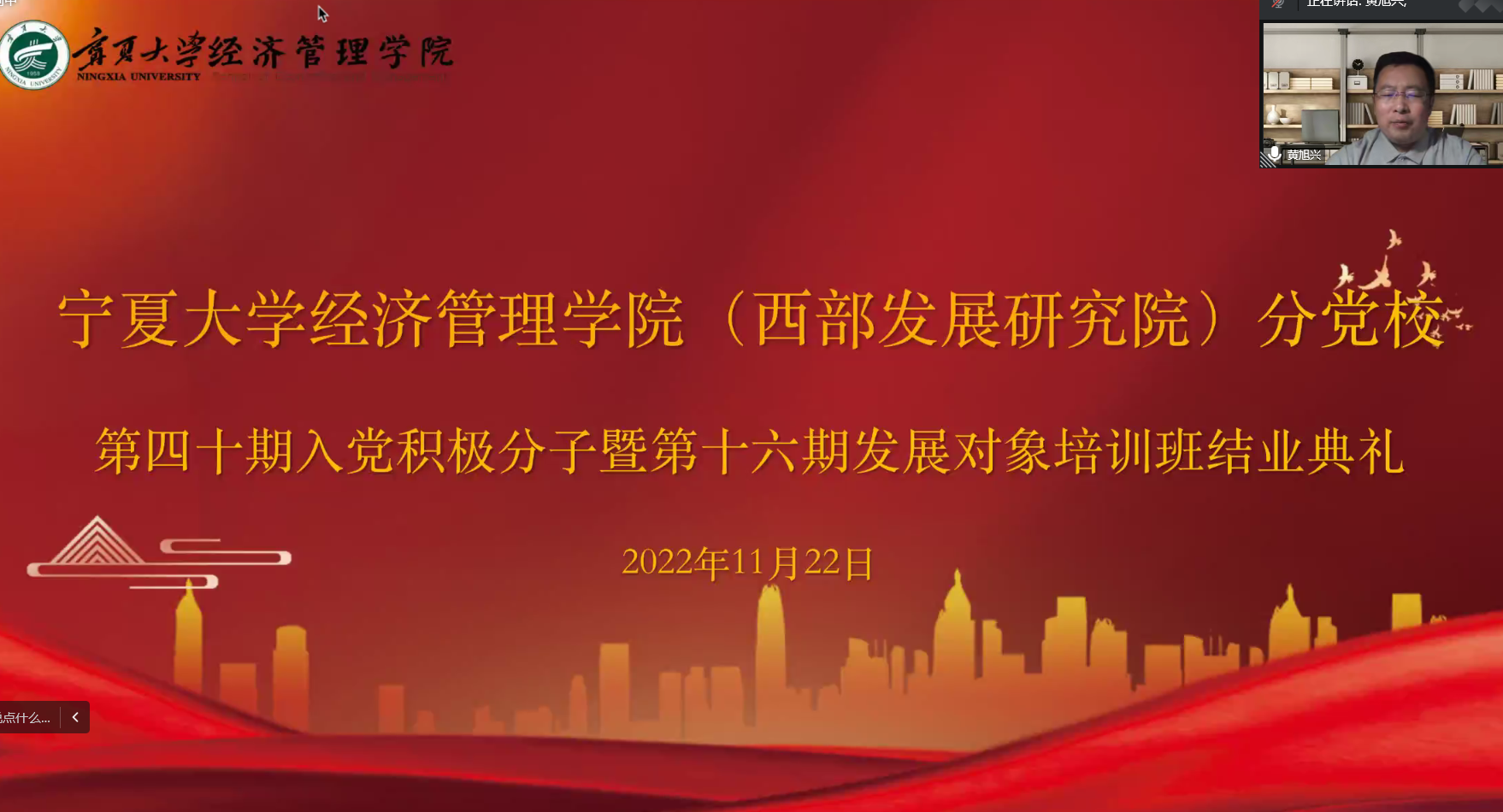 (西部发展研究院)分党校第四十期入党积极分子暨第十六期发展对象结业典礼在线上顺利举行。院党委副书记黄旭兴、党建秘书姚硕、第四十期入党积极分子和第十六期发展对象参加了会议。会议由姚硕主持。