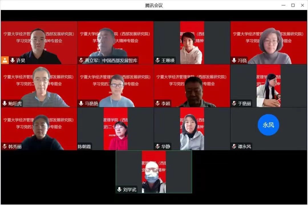 为深入学习贯彻党的二十大精神,11月9日,污污漫画 (西部发展研究院)召开学习党的二十大精神专题会。全院各系教职工、各办公室分别以腾讯会议形式进行学习交流。