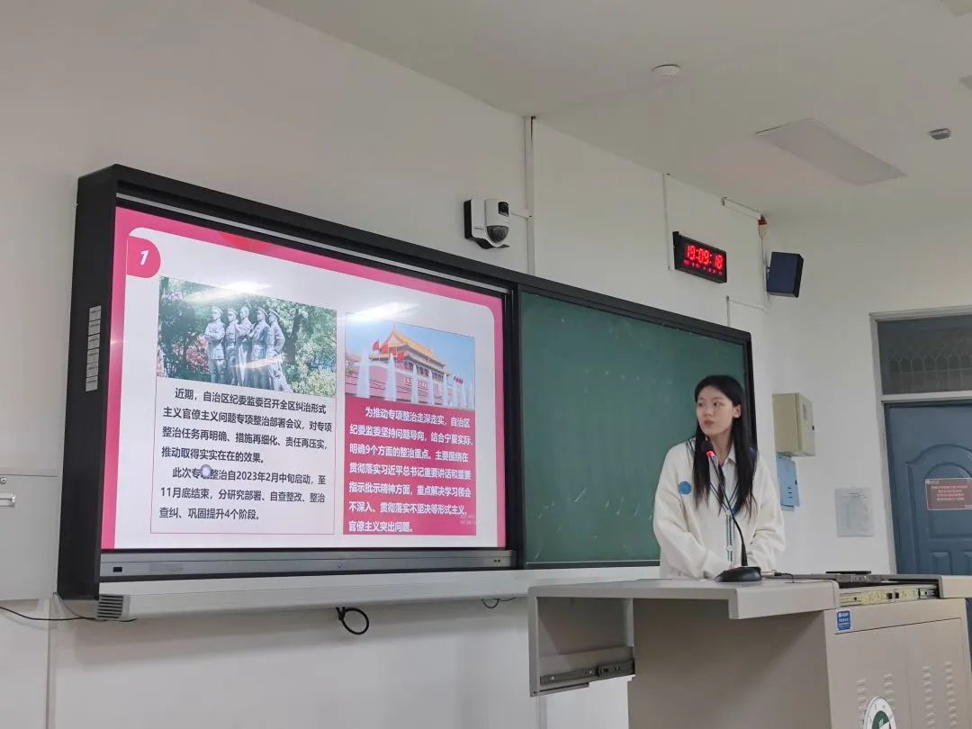 党员代表张澳群表示作为新时代的学生党员,我们要守纪律、讲规矩,自觉做政治上的“明白人”,不放松理论学习,不放松自身修养和素质的提升,不放松工作生活中的小节问题,自觉加强学习,筑牢理想信念;张淼同志通过学习认识到作风建设永远在路上,作为党员应当严于律己,行为要清正,切实增强自律观念,自觉抵制不良风气的侵蚀,高标准严要求,主动接受各位党员同志的监督;朱东升同志表示从反对形式主义和官僚主义来看,应当重点关注以下两个方面:一是要紧盯形式主义、官僚主义新动向新表现,充分认识形式主义、官僚主义的多样性和变异性,摸清其在不同时期、不同地区、不同部门的不同表现;二是要拿出真招实招,切实加强监督管理,抓出实效。